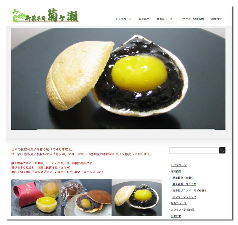 せたがやいちで10年以上お世話になっている菊ヶ瀬様より、独自のホームページを構築したいとのお話しをいただき、看板商品である「献上銘菓 栗最中」「献上銘菓 ひとつ栗」「喜多見ブランド:栗どら焼き」をご紹介すると共に、期間限定商品のご紹介を配信してまいります。